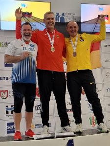 Vom PTSV Konstanz war Jens Kresalek (M50) am Start. Bereits am späten Freitag Abend fand dieses Mal der Speerwurf statt. Bei nassen und kalten Bedingungen startete Jens sehr gut in den Wettkampf und konnte im 1. Versuch mit 52,89m die Führung übernehmen. Bereits dieser Versuch war nah im Bereich der PB (53,05m) und hätte bereits zum Titel gereicht. Gleich in Runde 2 folgte der Paukenschlag mit neuer PB und starken 55,94m. Damit konnte sich Jens deutlich von der Konkurrenz absetzen und seine Führung bis zum Ende behalten. Mit deutlichem Abstand von über 5m gewann Jens die Goldmedaille und den Deutschen Meistertitel.